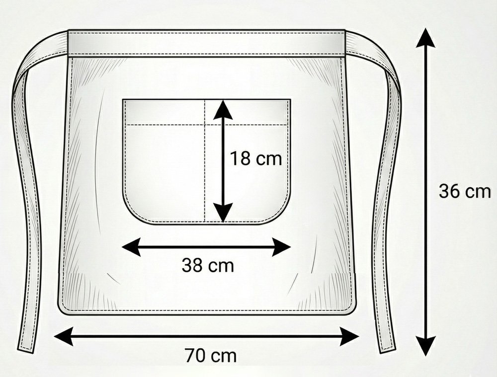- Mandil: 36 cm alto x 70 cm ancho