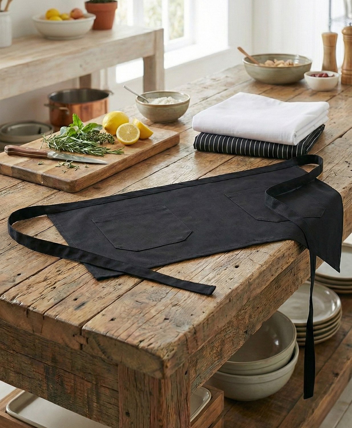 Mandil Chef Corto disponibles en 3 colores: Blanco, Negro o Negro con rayas blancas.